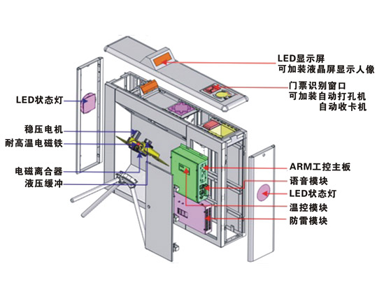 三辊闸具备刷二代证进出三辊闸具备打指纹进出,指纹容量10000每指纹,三辊闸具备LED显示功能,刷卡异常以及故障发生可以显示相关信息 配套考勤软件可以实现刷卡进出计费,显示照片,